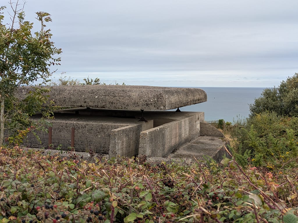 Aufbruch aus Arromanches stand an. Auf dem Weg zum nächsten Campingplatz besuchten wir zwei wichtige historische Sehenswürdigkeiten. Zunächst schauten wir uns Bunkeranlagen direkt an der Küste an.
